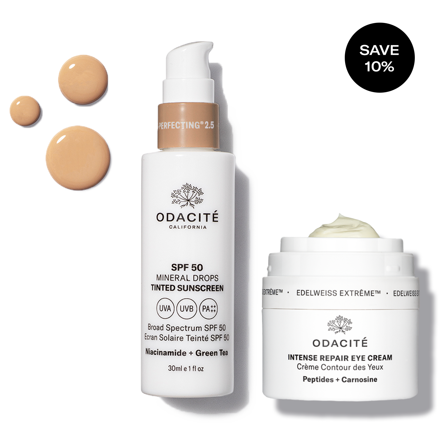 Mineral sunscreen that applies like a serum plus an eye cream with Edelweiss extract to tackle fine lines and fatigue — your complete morning defense without the heavy feeling.