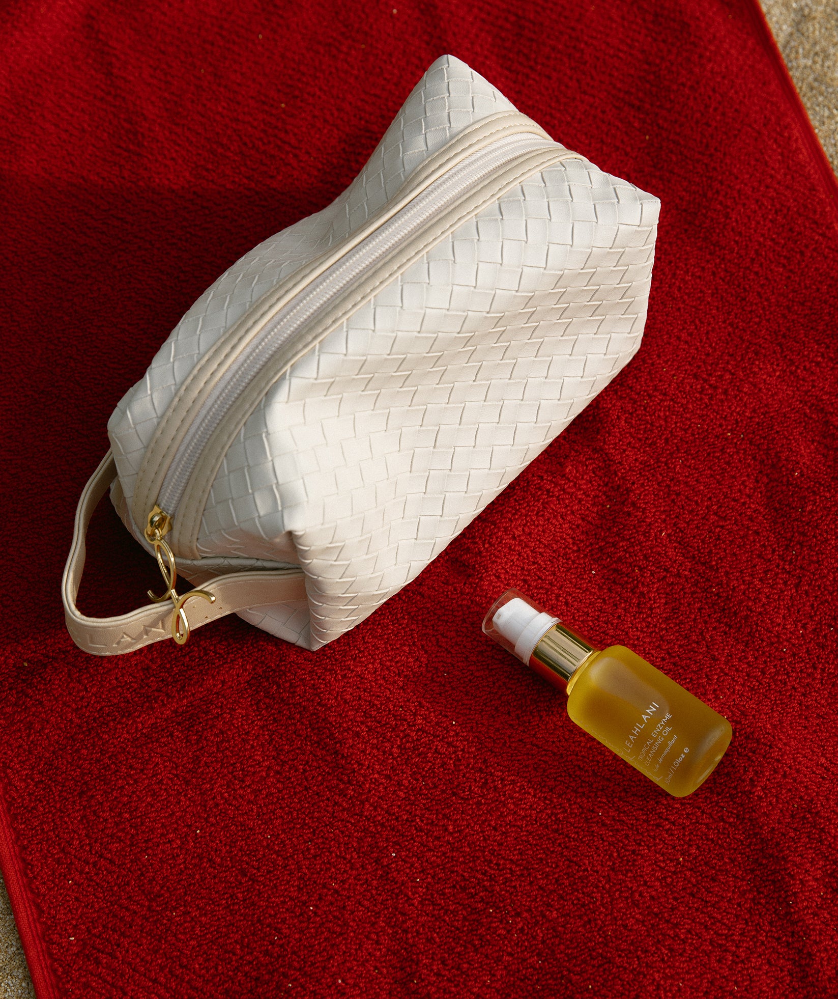 Splash-proof vegan leather with an easy-clean lining—designed to keep your full-sized bottles and minis organized without the mess of a regular bag.